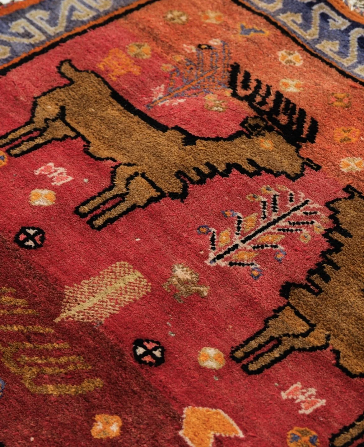Close-up of one of Mazar’s favorite rugs, featuring traditional motifs. The design includes stylized wild deer, walnut symbols, and native trees—reflecting the natural surroundings and stories of her region.