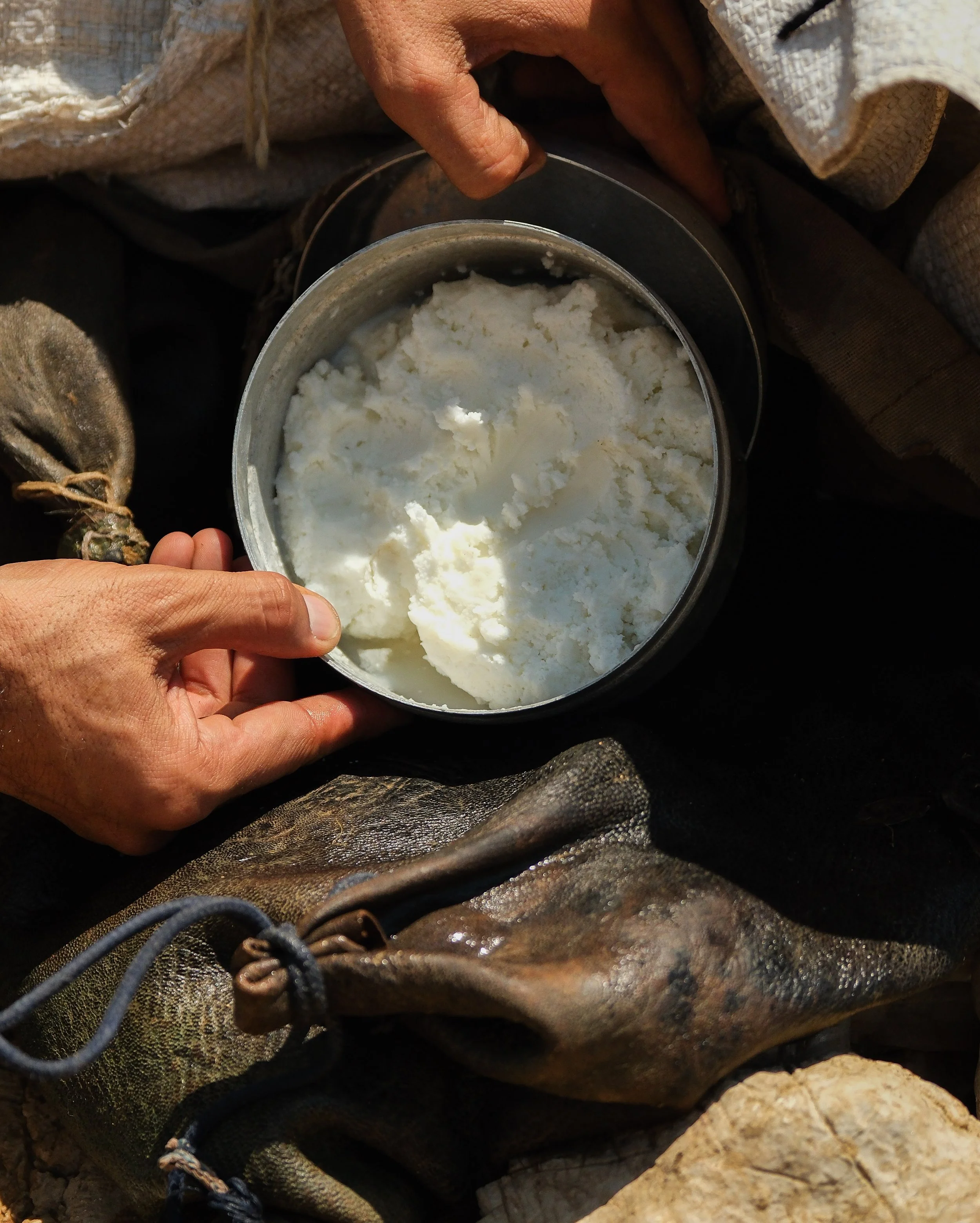 Frozen butter stored inside repurposed goat skin to function as a natural freezer. The insulated skin helps preserve the butter for extended periods without modern refrigeration.