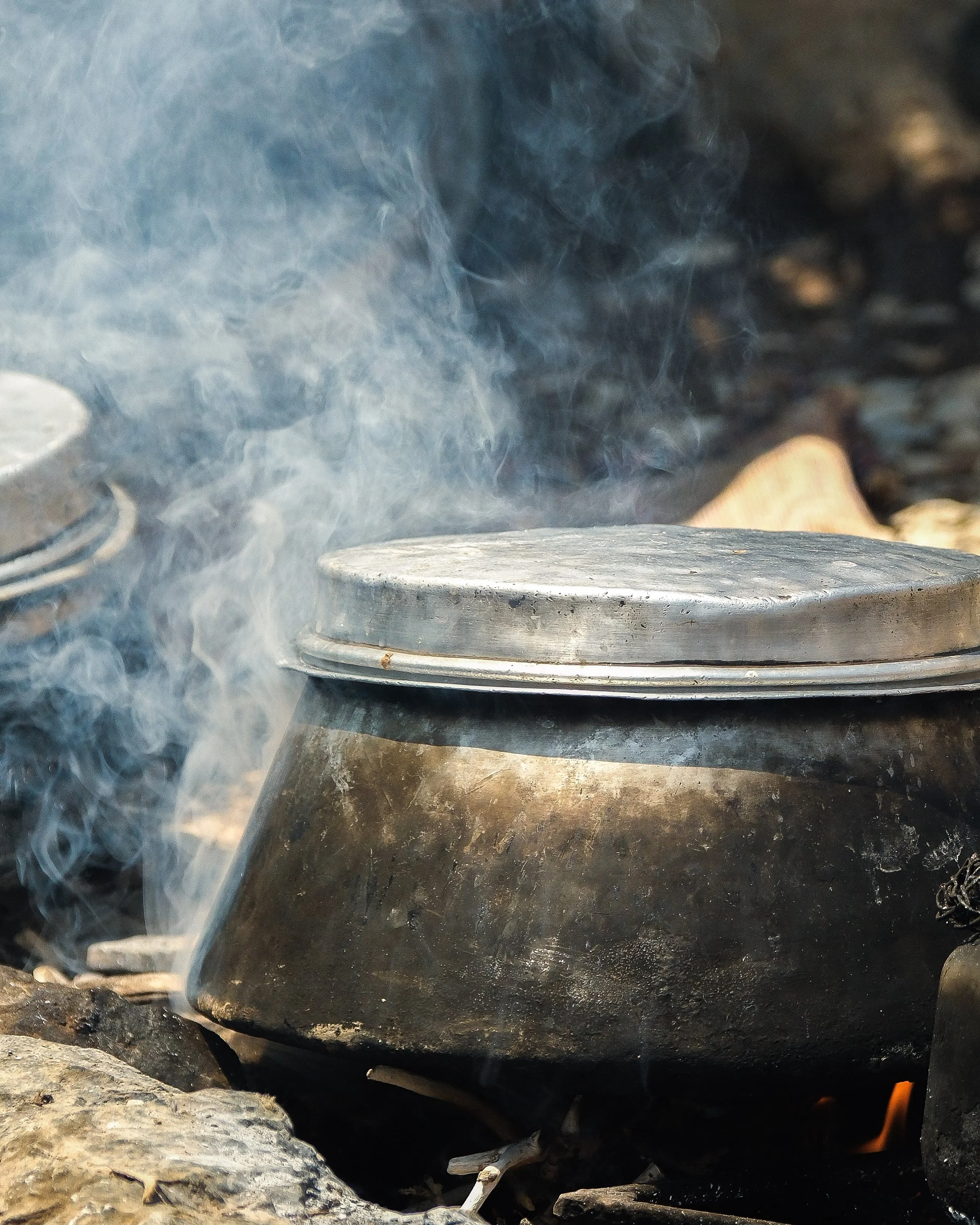 Mazar leads her goats into their coop at the end of the day, preparing for the evening milking routine. The goats are milked by hand, with the fresh milk collected directly into a metal pot. She then boils the milk on an open flame to sterilize it before use