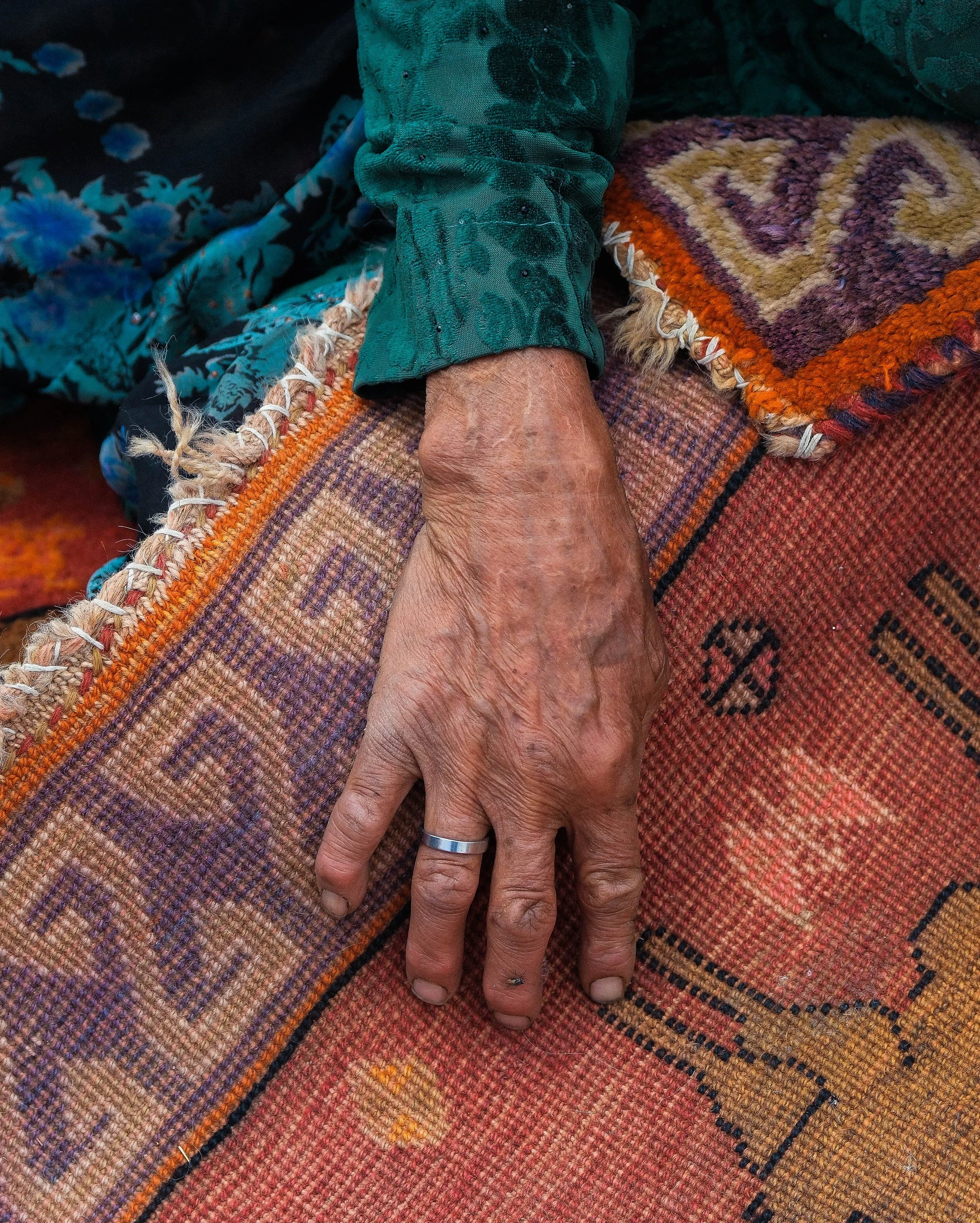 Beyond her ability to endure and adapt to mountain life, she’s also been a talented carpet weaver since the age of seven. When asked “How do you prepare for your carpet designs?”, she answers “There is no preparation. Look outside. What do you see? The mountains, the wild trees, the walnuts, the goats, the colours. I simply lay my eyes on the world and begin weaving”. For Mazar, weaving is not a task—it is a translation. She honours a language passed down generations. She does not only live in nature. She listens to it, speaks through it, and becomes it. She is Mazar.