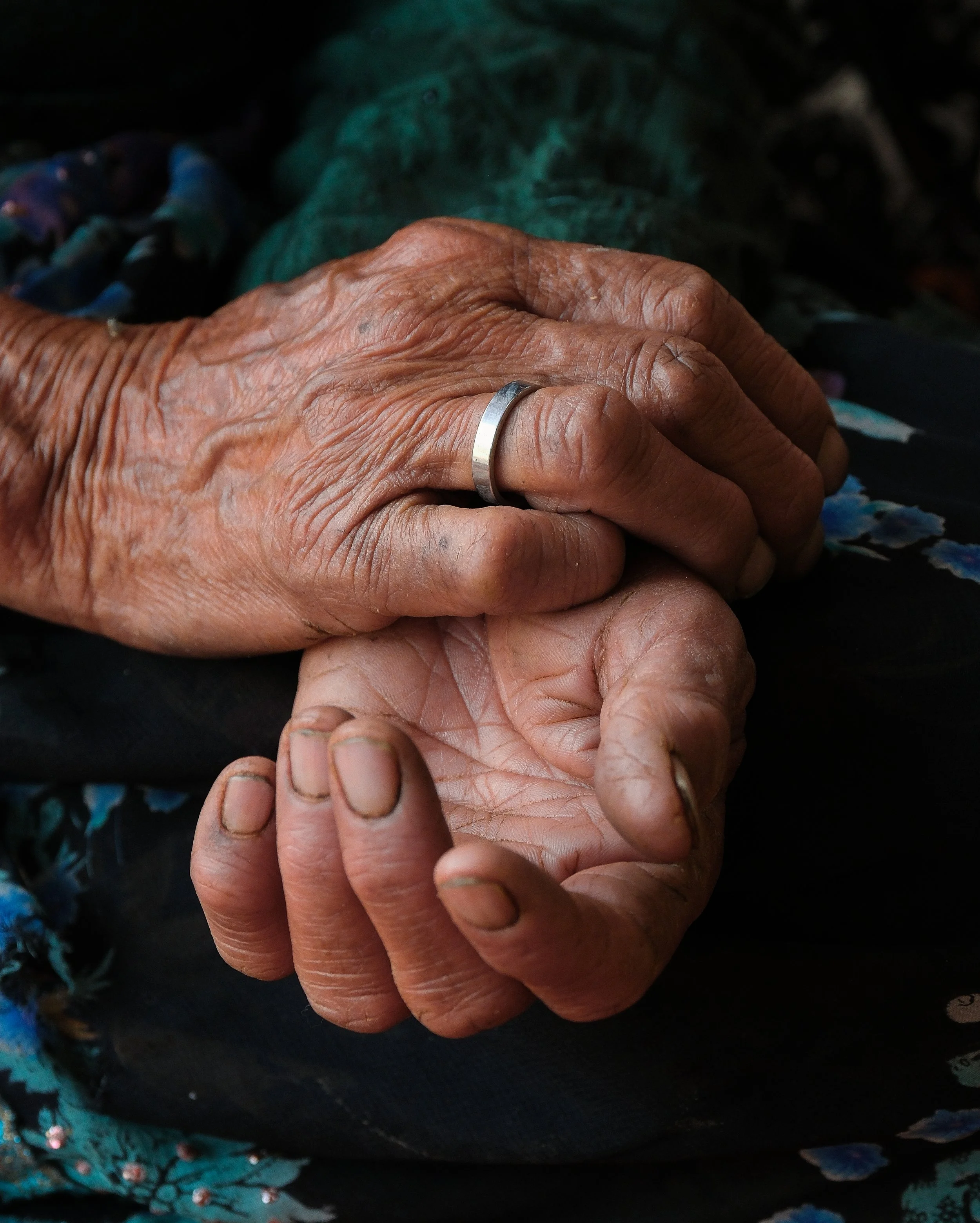 A close-up of Mazar’s hands, showing visible signs of age and years of physical work. The texture, marks, and strength in her hands are a defining part of her presence.