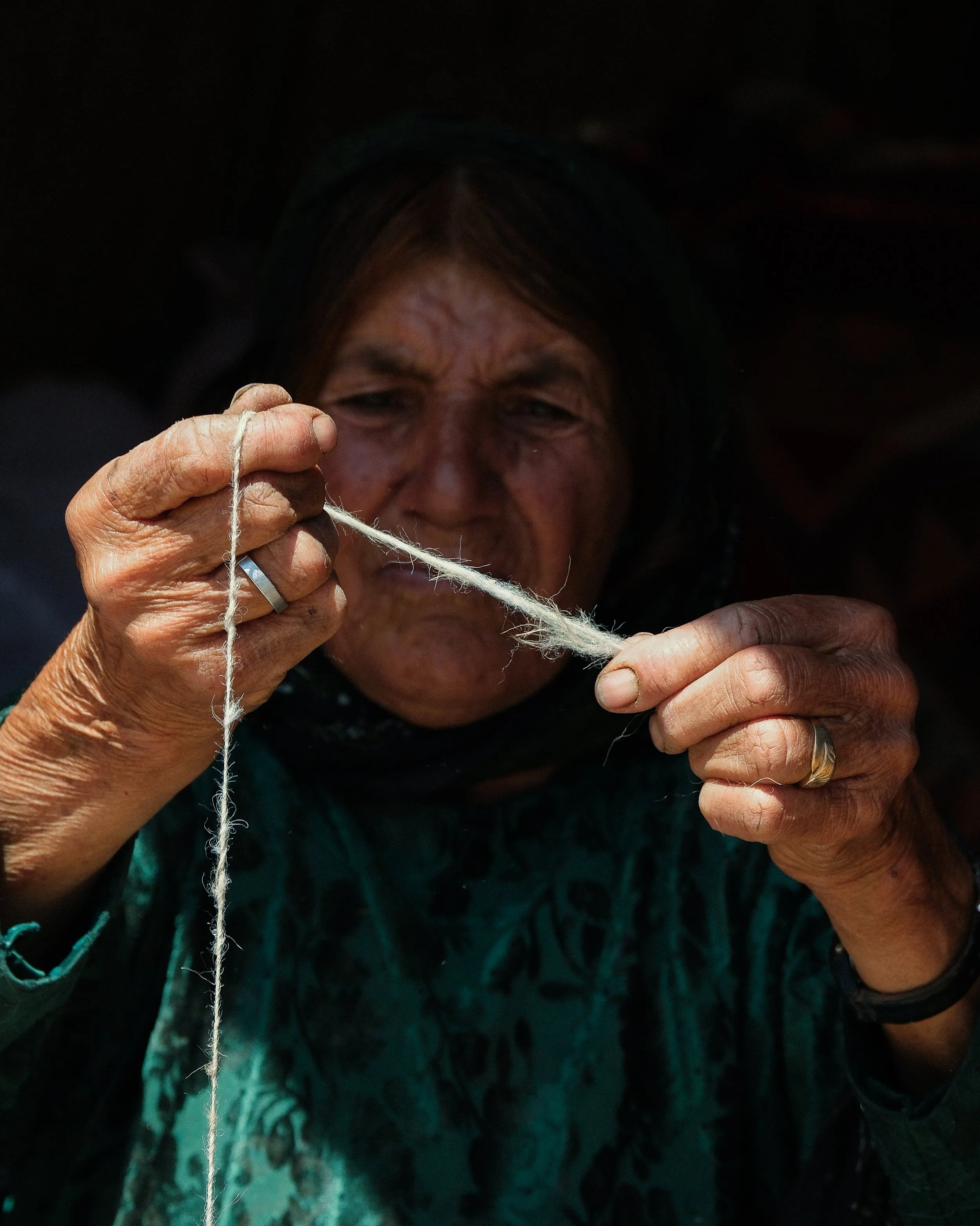 Mazar prepares yarn made from goat fur. The same fur that is used to create her carpets, roof and clothing for winter.